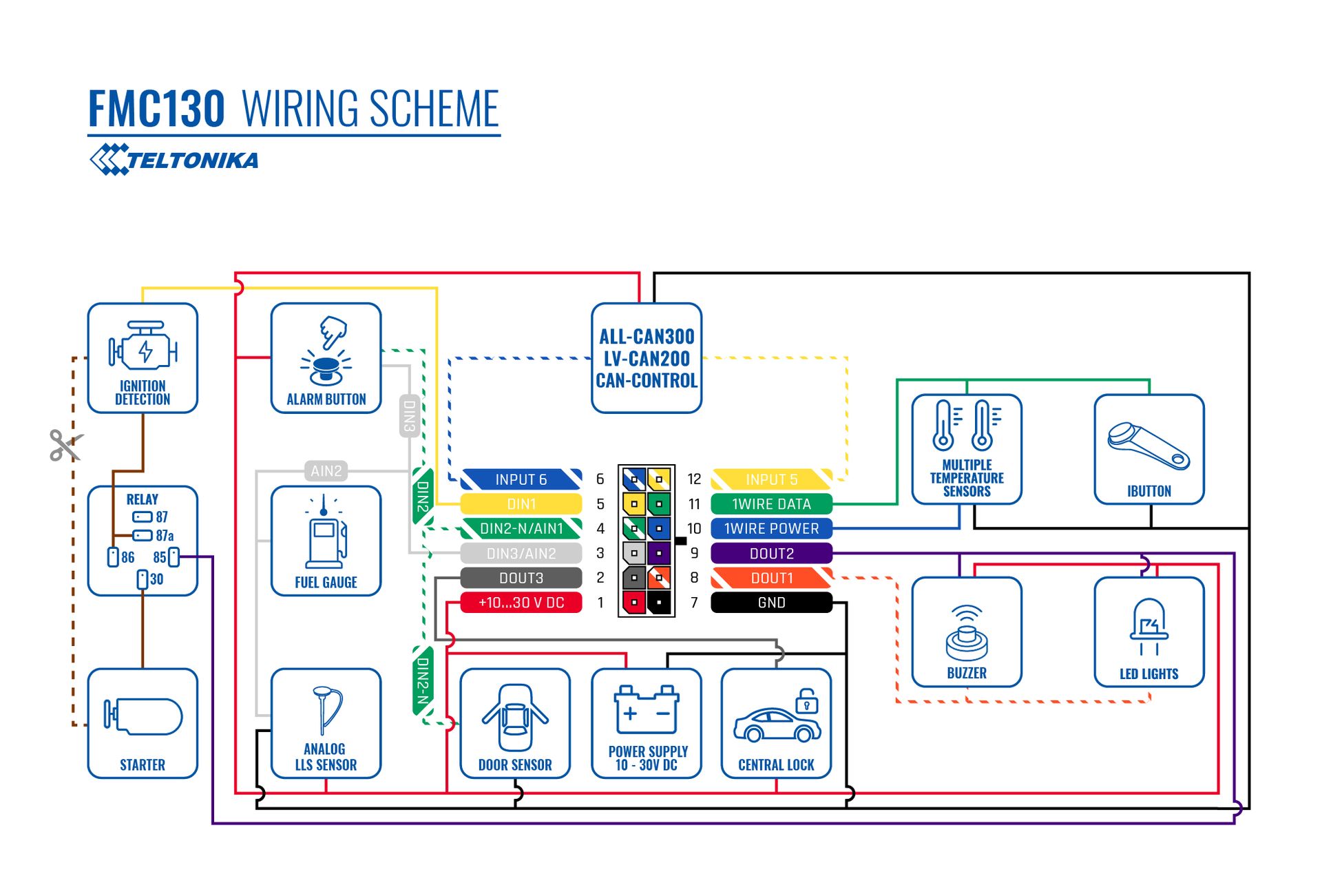 connexion d'accessoires tels que le capteur de portes du véhicule, les boutons